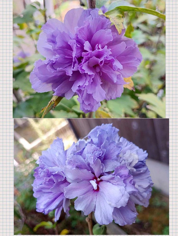 ①②ムクゲ「紫玉」 最近の雨☔でカリカリでもう終わりかと思っていた小さな緑の蕾も膨らみ、今になり毎日数輪の花を咲かせています🥰元々、晩夏から咲き出すタイプ💜ムクゲらしい枝花になってます(🐢)