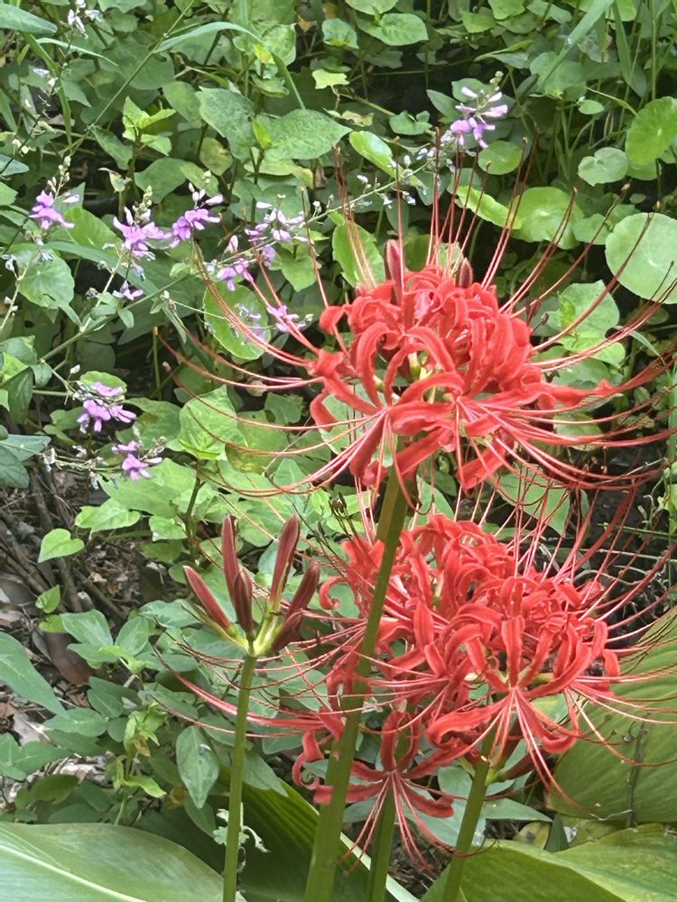 裏庭のヒガンバナがやっと咲き出しました🤗2枚目からは散歩公園の彼岸花で、アレチノヌスビトハギだらけの公園なので、どこの彼岸花にも写り込んでます😅🌿💕🌿