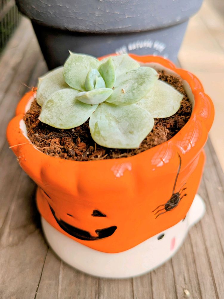 早速、うちにあったハロウィン🎃の入れ物に植え替えてあげましたとさ♬