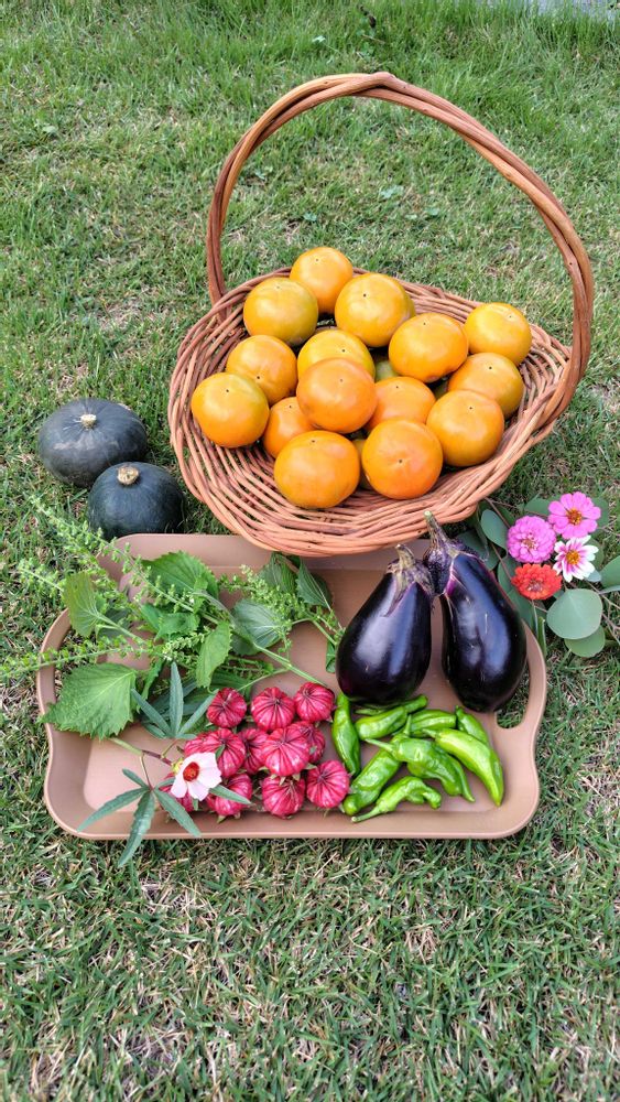朝採り野菜と柿とローゼル