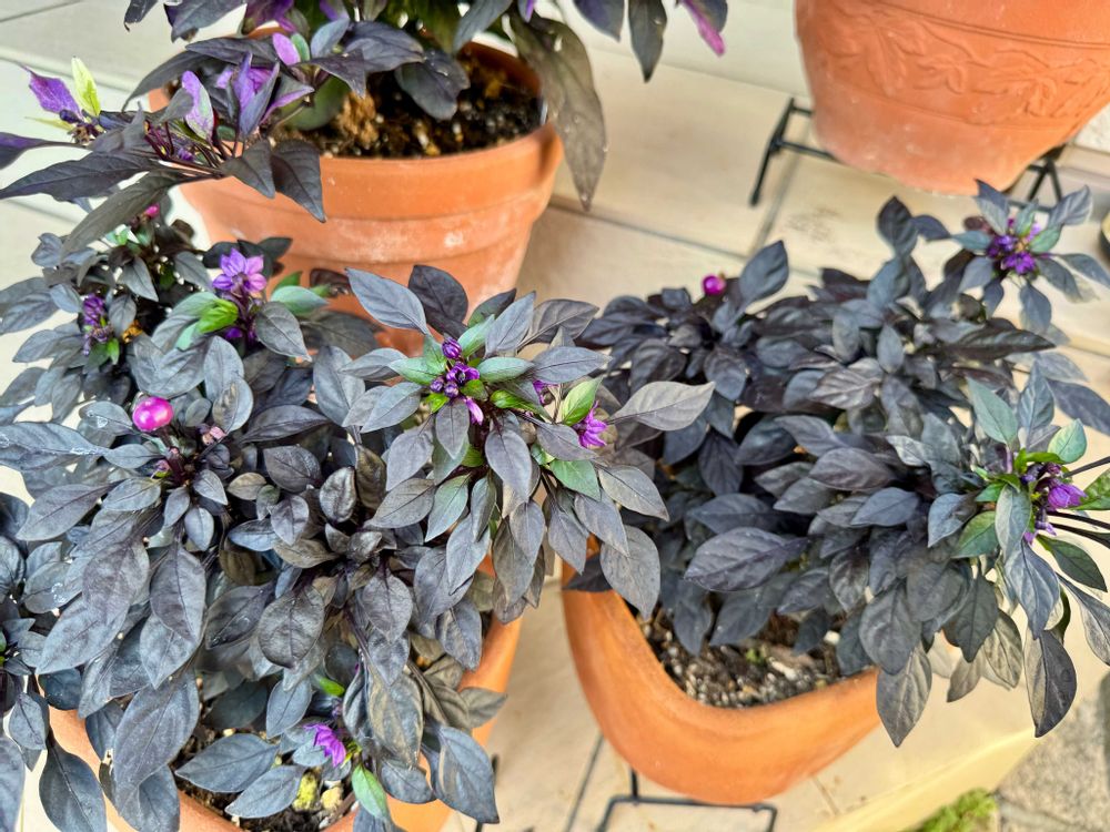 パープルの葉っぱと、素焼き鉢の色が、素敵ですね。
