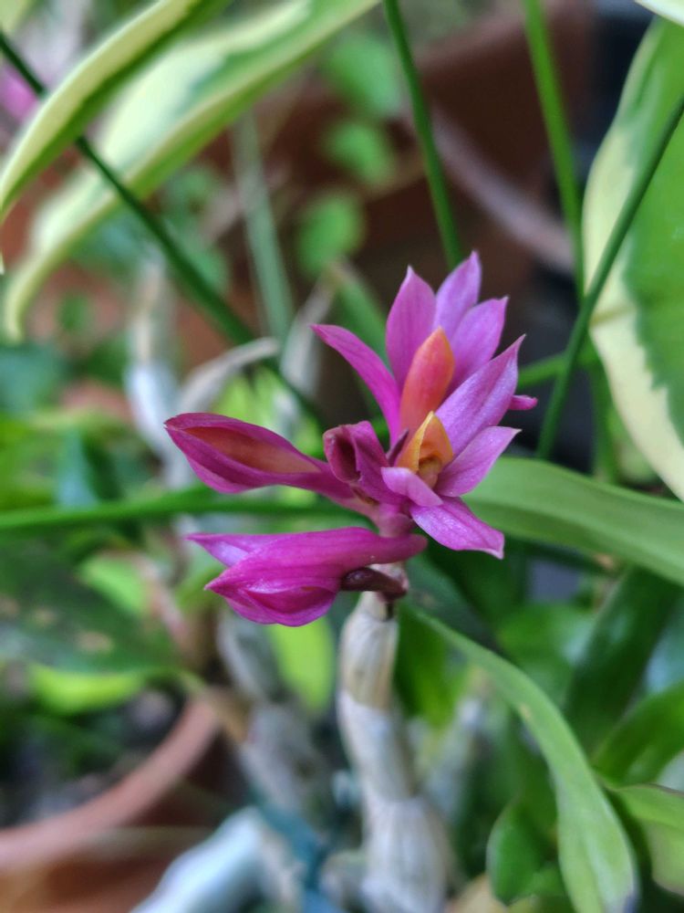 デンドロビウムヒビキ、ちょっとだけだけど初開花、ずっと屋内管理でよれよれだったので半日陰の外管理に変えたら元気になりました。