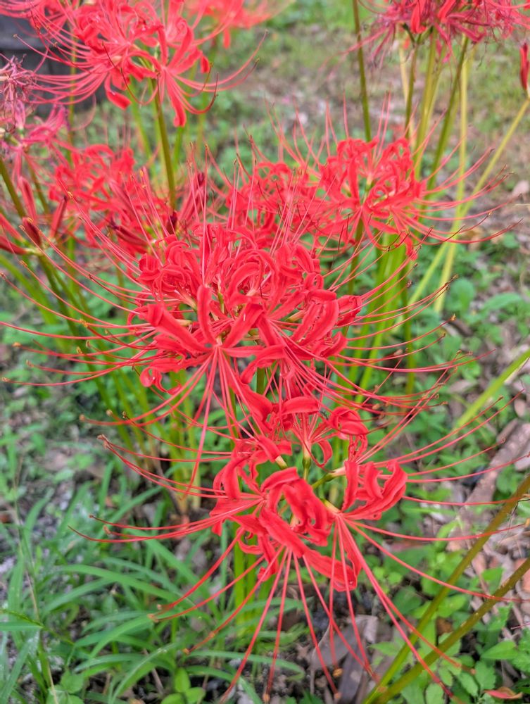 数年前に植え付けた彼岸花ですが今年も無事に咲きました。球根が分球して年々増えてます。