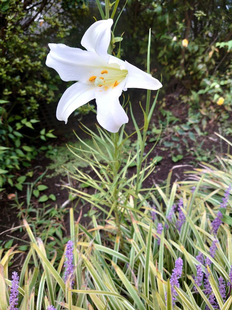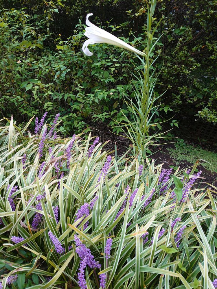 3️⃣4️⃣シンテッポウユリとヤブラン🤍💜昨夜のワンコ散歩でシンテッポウユリが又咲いているのを見つけて🤍👀明日の朝撮ろうと狙っていたのです😁今朝まで咲いてくれました😊帰りでも咲いてたけど🤭