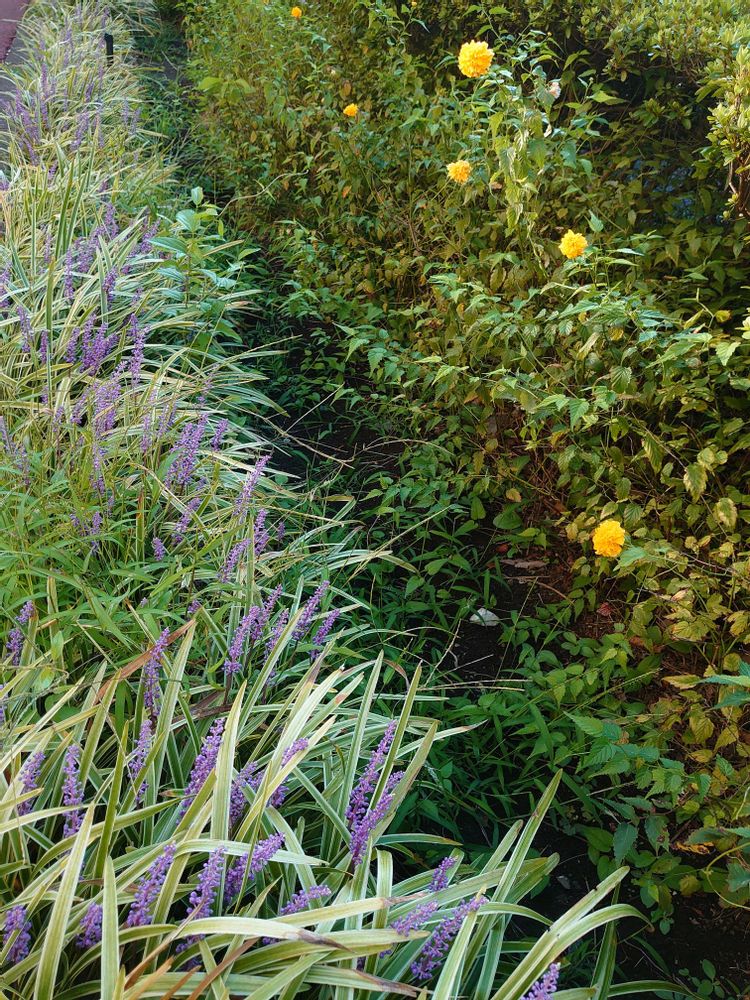 5️⃣ヤブランと八重のヤマブキ💜💛ヤブランは今が盛りですね綺麗に咲いています💜