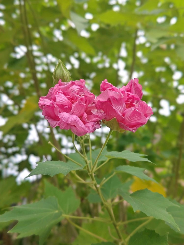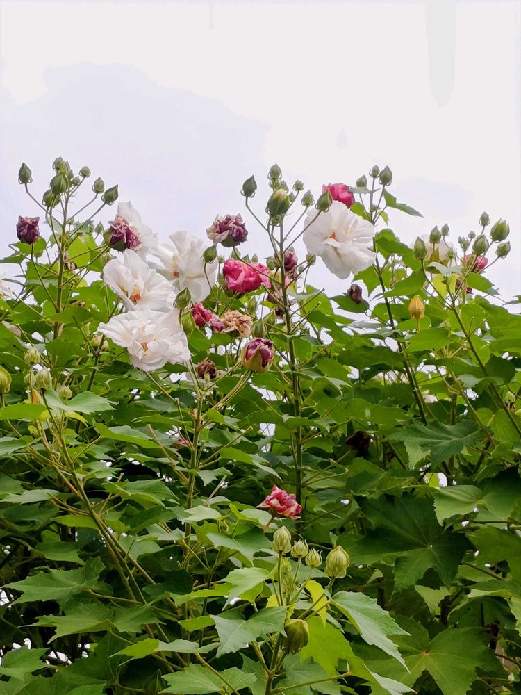 いつもの観察、酔芙蓉。曇り空の午前、白く咲く花と前日の萎んだ濃いピンク。