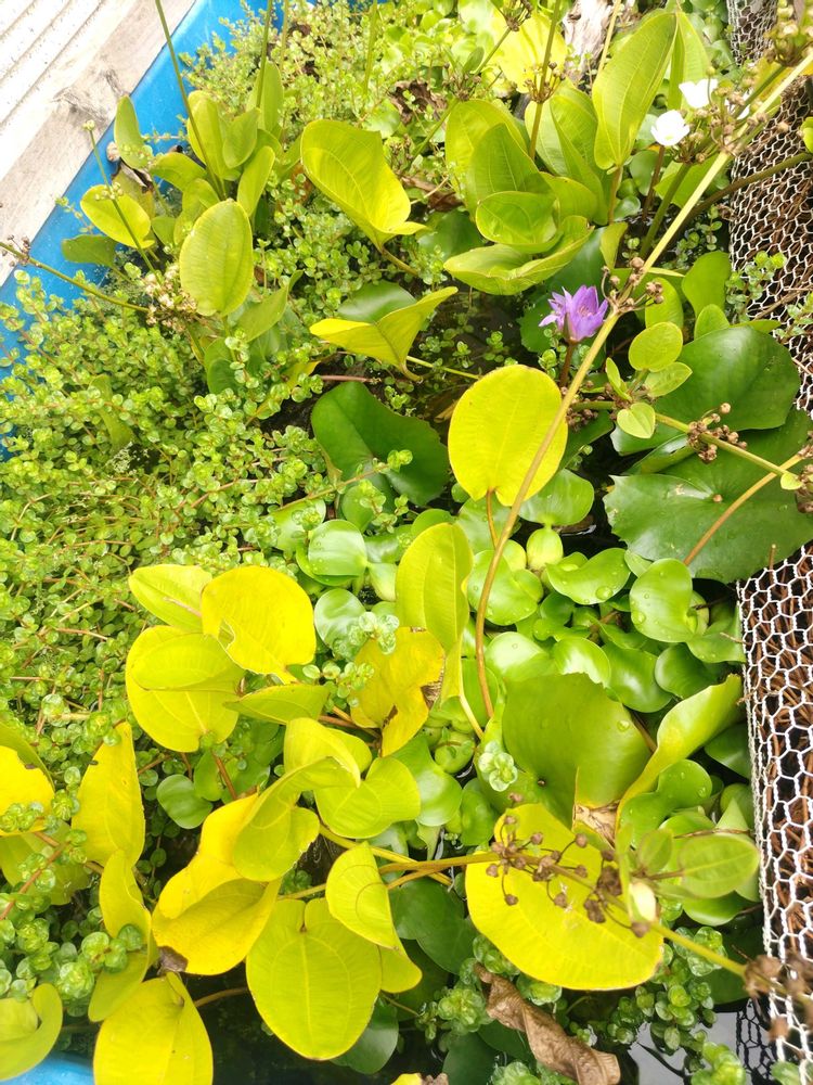 赤ちゃんメダカ。毎日のエサに癒されています。ホテイアオイのお花。