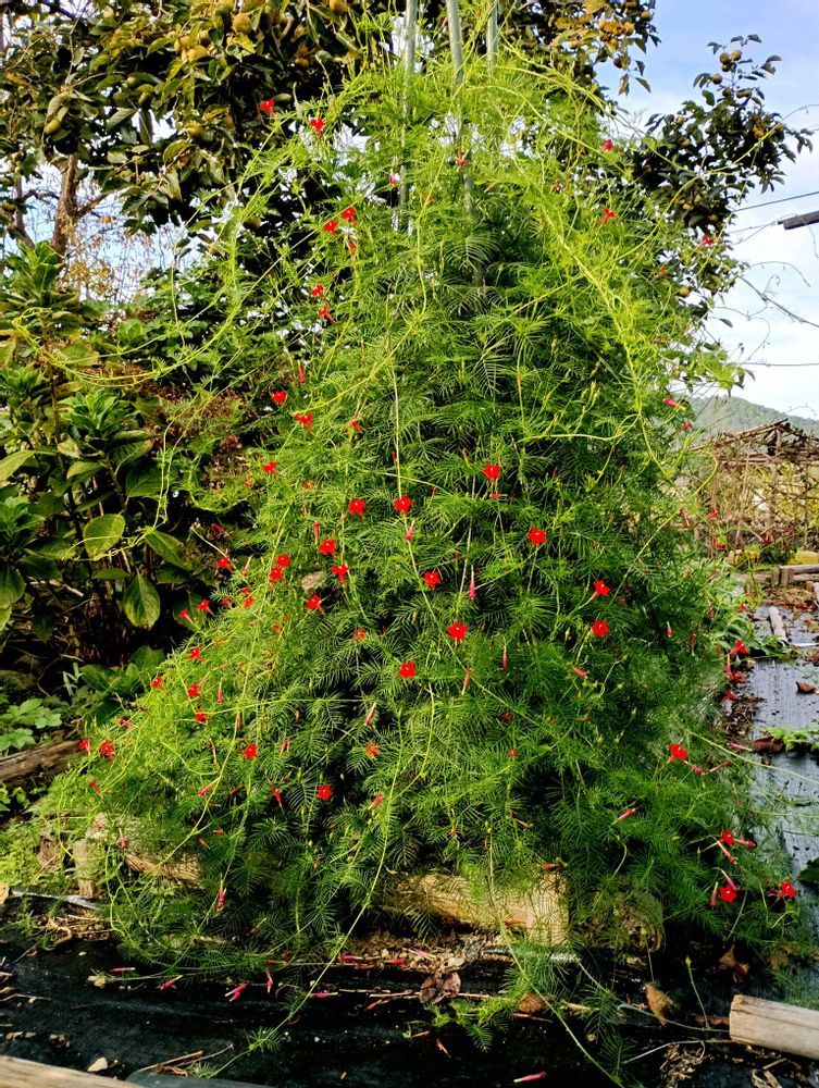 クリスマスツリーにするつもりじゃなかったけど ツルが好きな方へ伸びるから支柱を立てて巻き付けていた 久しぶりに覗いたら 赤い花がそれなりに咲いてるし ツリーのような感じになっていました😅😆😀