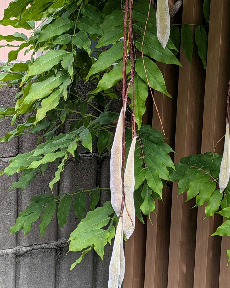 ③春にフジ色の花を咲かせた後にはエンドウ豆がぶら下がってます。