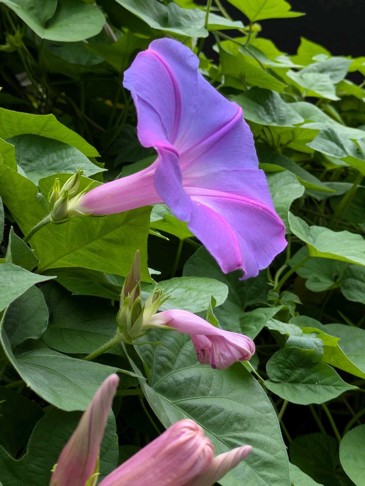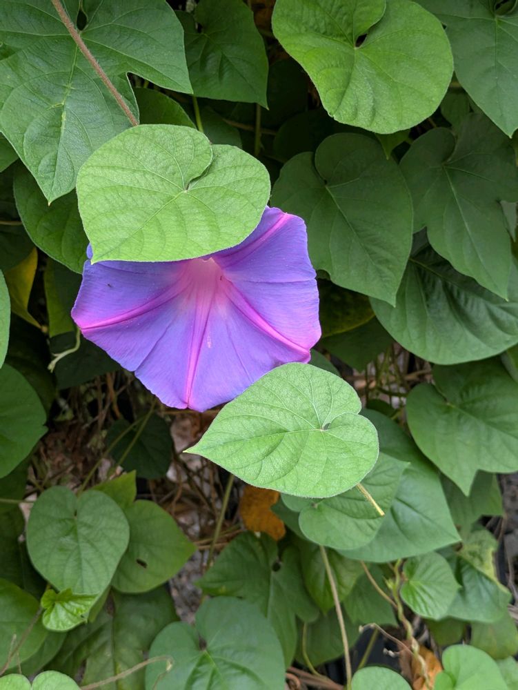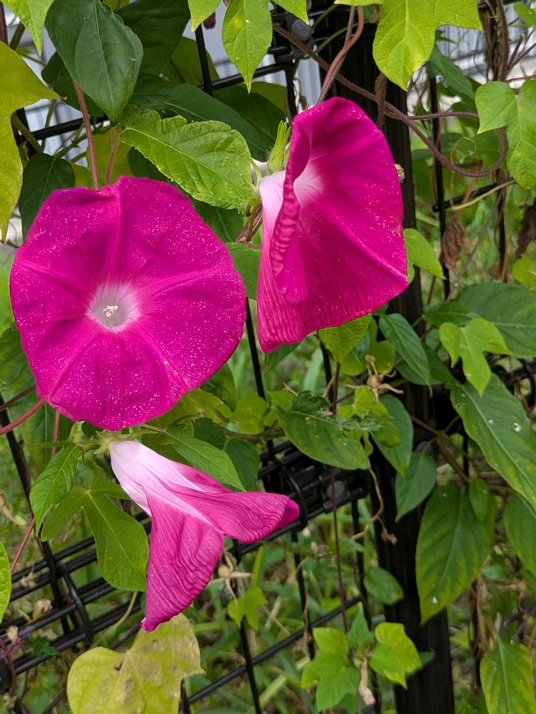 ①②マルバアサガオ ヒルガオ科 サツマイモ属 フェンスに絡めて植えられていたもの。高く何メートルも駆け上がっていました。
