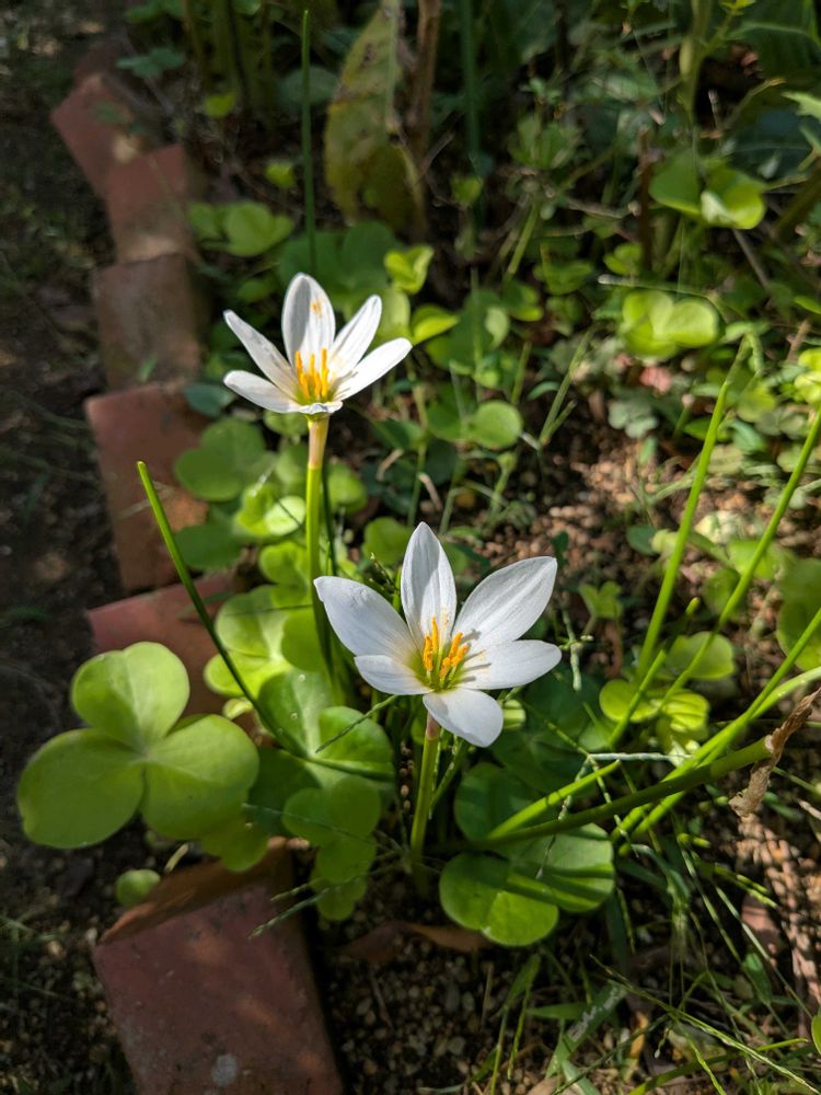 秋の庭では可愛い白い花タマスダレ、🩷のオキザリス、涼やかな色合いシオンやセージ、🟣ノボタン達が咲き乱れているね‼️