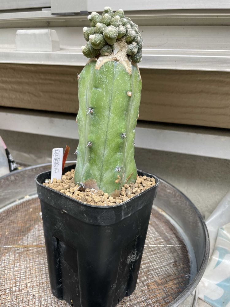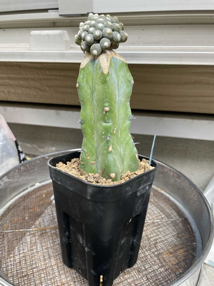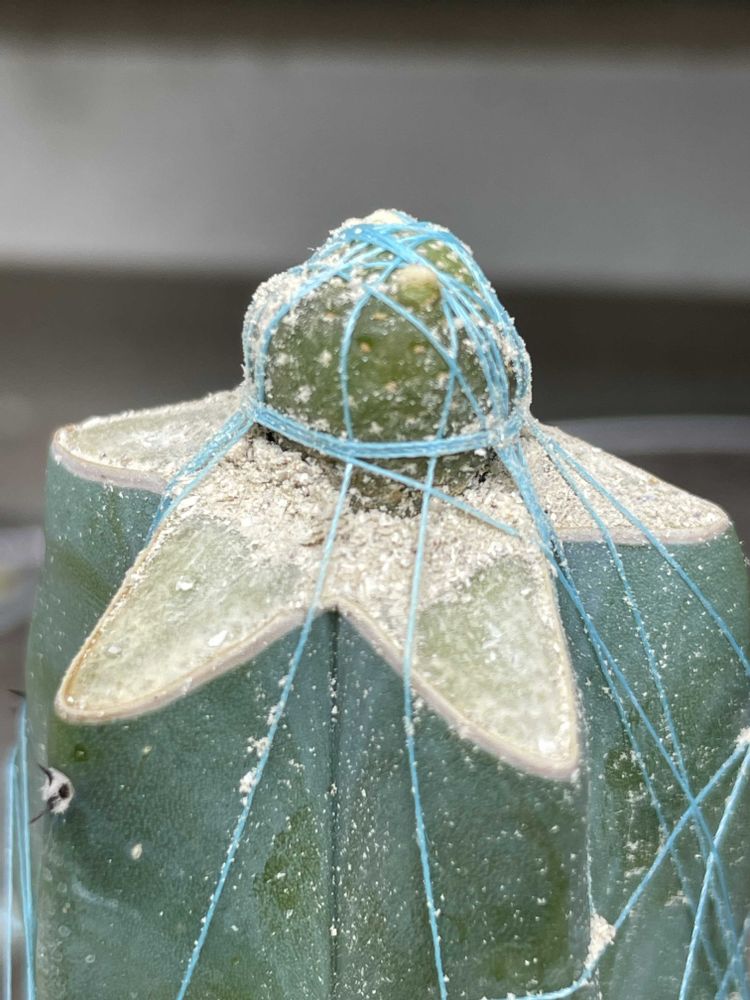 サボテンくらぶの人のアドバイスで固定は伸縮包帯より、糸の方がやりやすかった。④⑤継いでから切り口に有機石灰を塗しました。