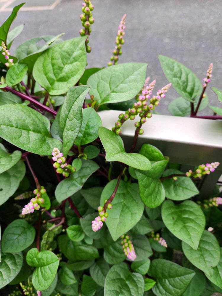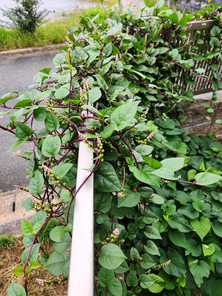 庭のフェンスに絡み合いながら道路側まで延び続いてます😁
