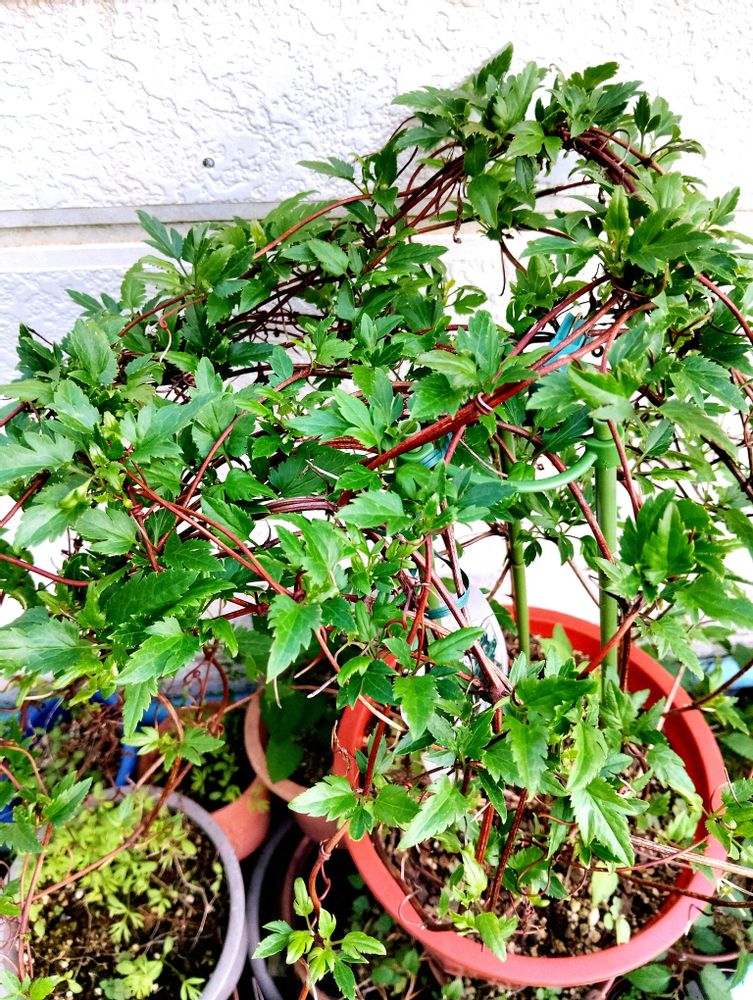 冬咲きクレマチス シルホサ、旧枝咲きなので剪定せずにいたら、この間まで枯れ枝だけだったのに、あっと言う間にこんなに🌿がワサワサに(@_@。