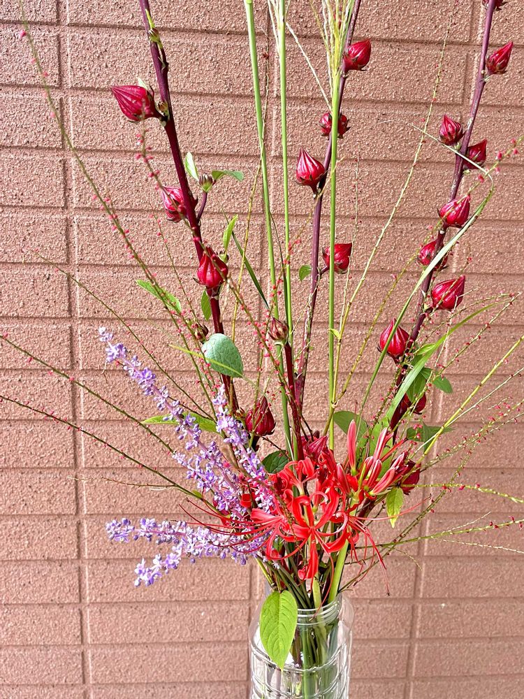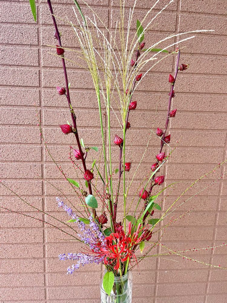 ④⑤ 道の駅で見つけたローゼルとヤブランとススキの花束♡