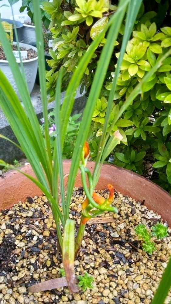 片隅で何やらオレンジの色が見えたので、よくよく見ると、何と!小さな小さな「ヒメヒオウギスイセン」が、全力で花を咲かせていました💖💖💖