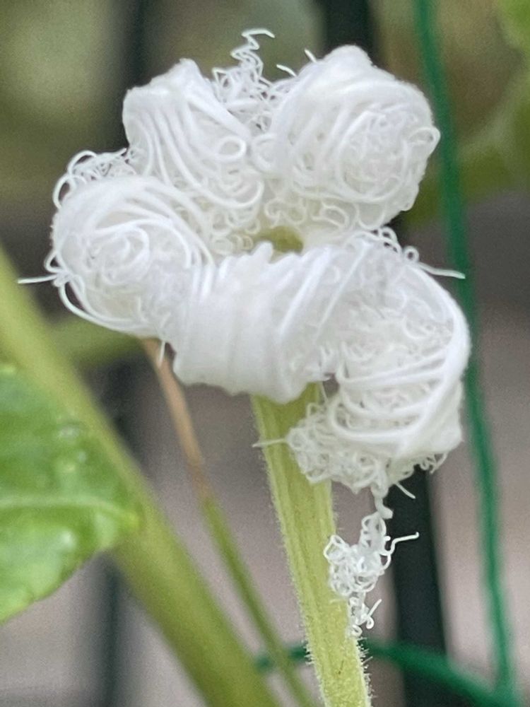 カラスウリにお花が似ていて、びっくりしたのです。ただ、この写真を撮った時9:30位です。カラスウリと違うのは咲く時間が違うんですよね。カラスウリは夜中ですからね。朝は萎んでしまいますよね。こんなにお花が似ているのに咲く時間が違うなんてって思いました😊