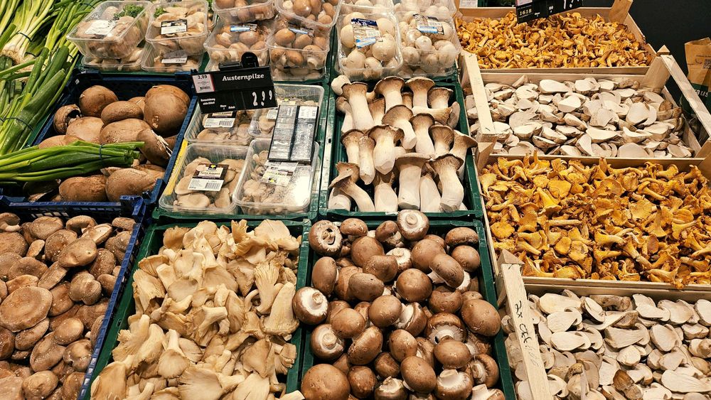右側の黄色いっぽいキノコは、フェファリングと言って、この時期にパスタやスープ、シュニッツェル(ドイツ風トンカツ)のソースなどに使用され、レストランのメニューに加わるんですよ🎶