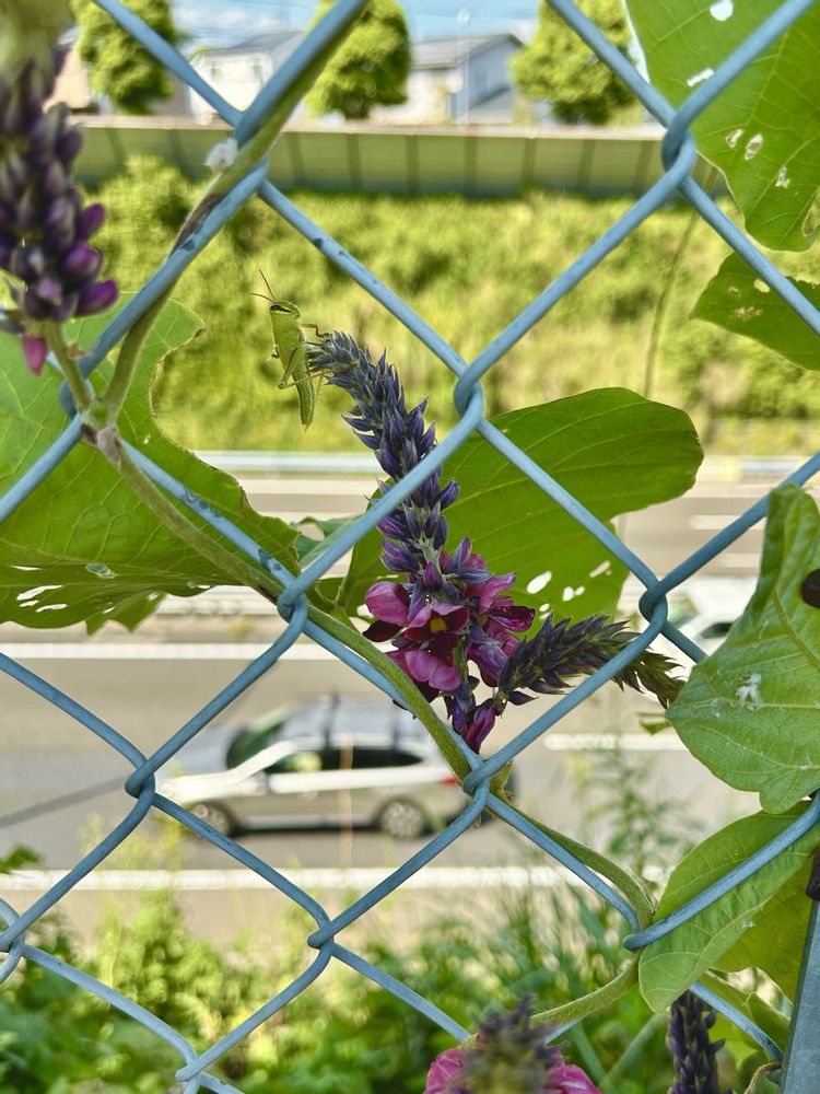 🎶中央フリーウェイ〜〜〜を眼下に見るのどかな散歩道。フェンスには下から這い上がって来たGReeeeNモンスターが強い匂いを放っています。おや?🦗バッタのチビ助がちょこんと取り付いています(*^^*)