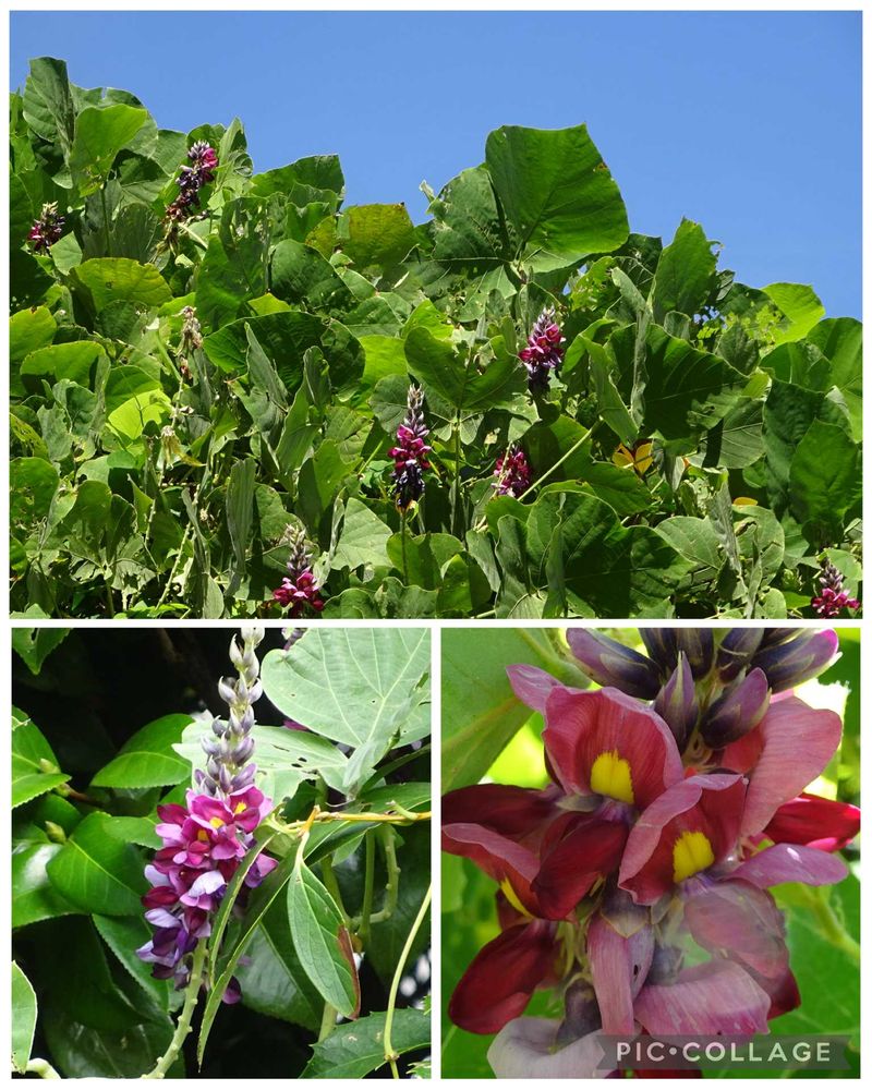 ↑毎年 覆い隠すように木々に絡みついて茂るだけでお花は咲かなかったのに、今年はいっぱいお花が咲いて、青空を背景に