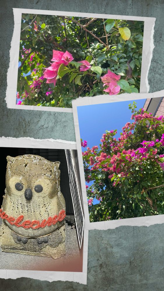 ③この🦉さんには南国ぽい花が似合いそう、とブーゲンビリアとコラージュしてみました😊