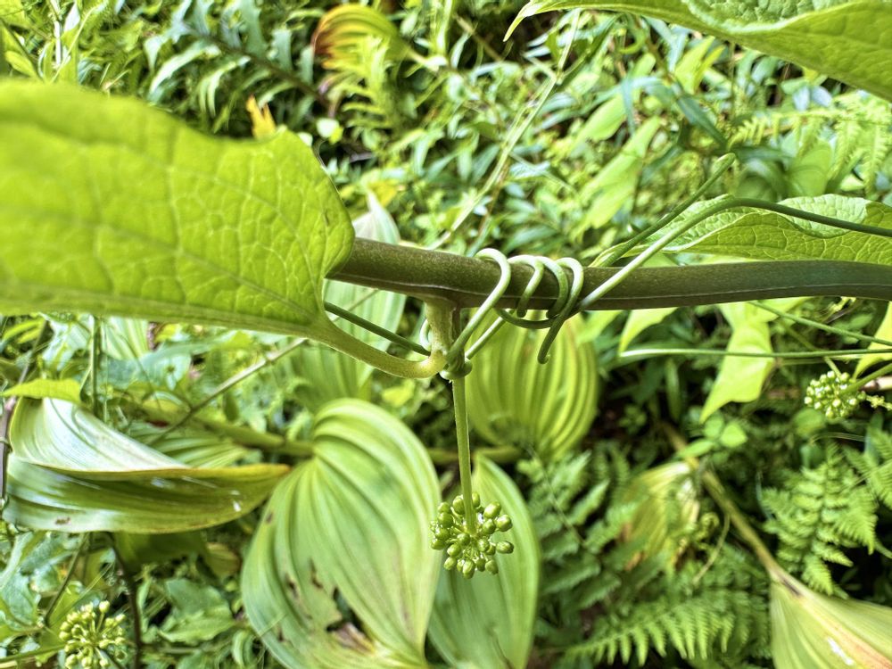 地味なつる性植物ですが、山菜としてとても人気の、ヒデコ、森のアスパラガス、あるいは「山菜の女王」と呼ばれるシオデです。黒く熟す実をつけます😍
