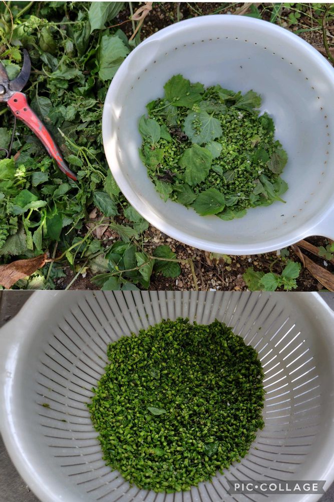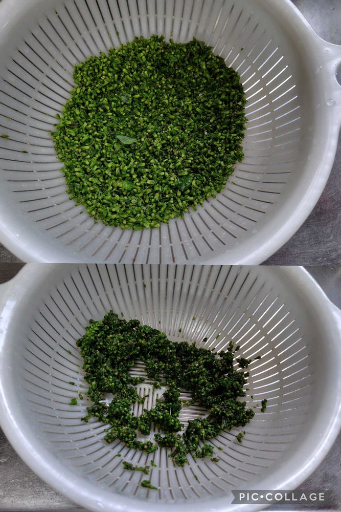 ①いつもは抜いて捨てている しその茎花ともさんから教わった しその実をめんつゆで漬けてみた