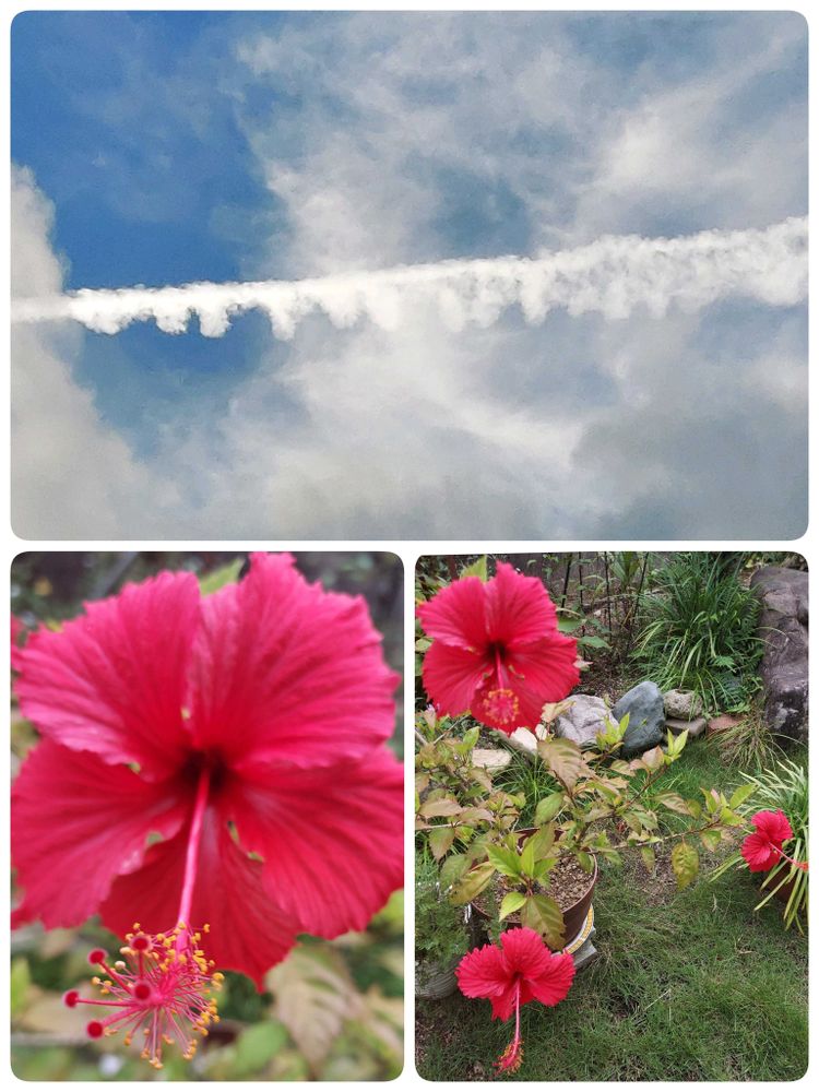 昨日 久しぶりに 我が家の鉢植え ハイビスカス🌺さん 4輪 咲いていました。1枚はアップで 空を見上げると