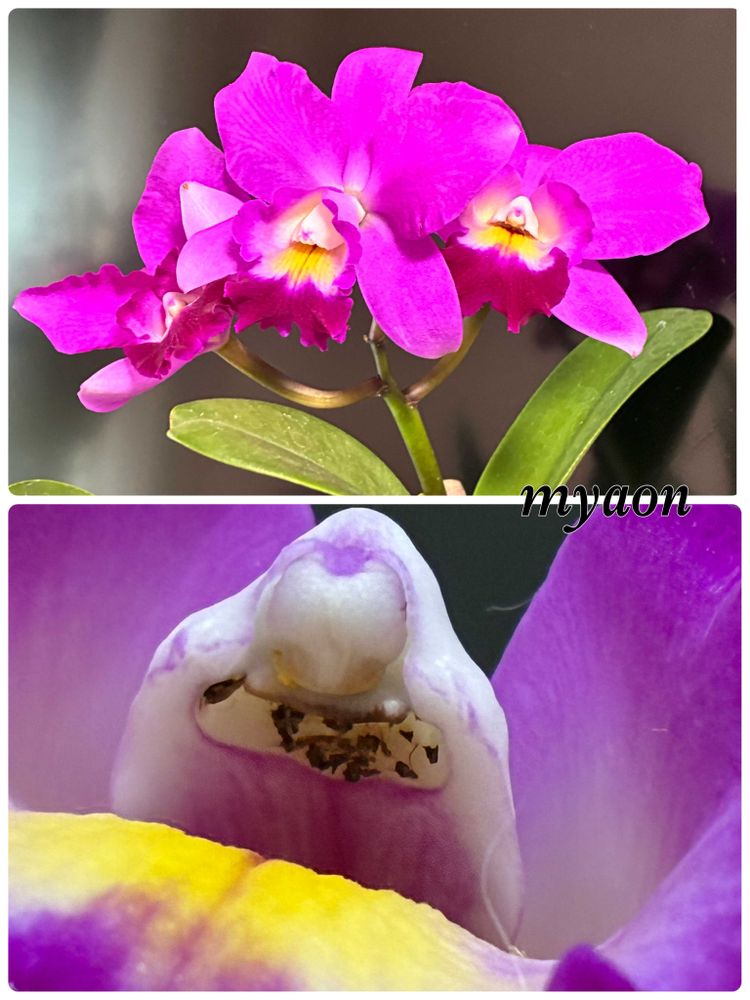 4枚目:C.Mini Purple'Little Princess'カトレア ミニパープル“リトルプリンセス”開花してしばらくお外に置いてあり、🐜ありが沢山付いていた。アリを払って家の中にれ蕊柱の受粉器官が真っ黒…よーく観察してみたらどうやらアリが