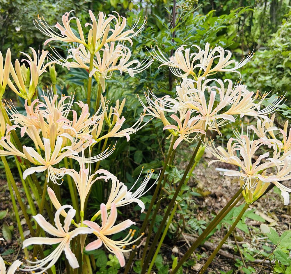 我が家の小さな庭のヒガンバナが咲き始めました✨今年は色味がキナリ?な感じが多い白です。二カ所くらいにマスタードイエローな花が咲く場所があり、お客様がいつも欲しがっているので差し上げています✨
