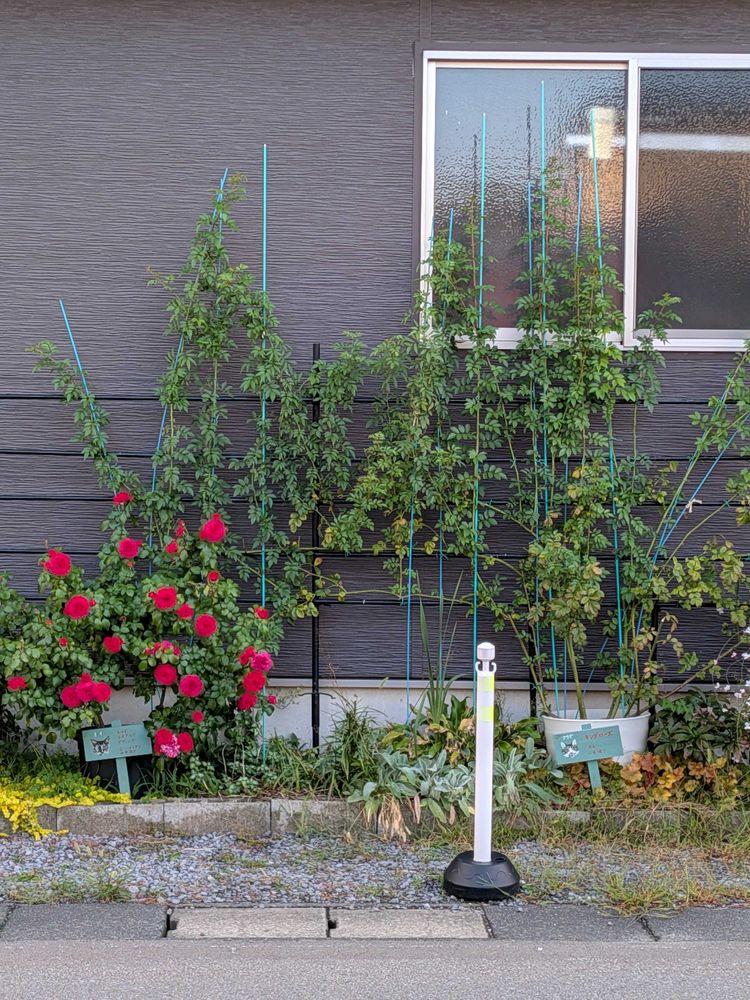 車庫横の花壇に半地植えで大きな鉢を少し埋めてバラを植えてます。