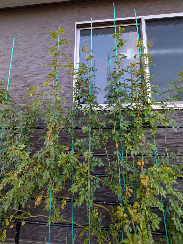 キングローズのシュートの乱立ぶりをご覧ください😁もうシュートを支えるグラスファイバー支柱が足りないし、立てるスペースもない💦あとから伸びてるのは斜めに誘引したりして誤魔化してる。