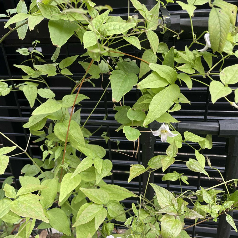 クレマチス クリスパエンジェル🩵が 咲いて来ました ホネホネだった茎から 葉を伸ばして チロンと小さな花を咲かせてます
