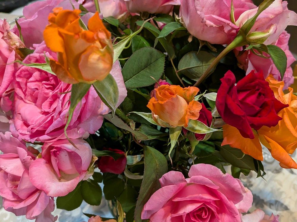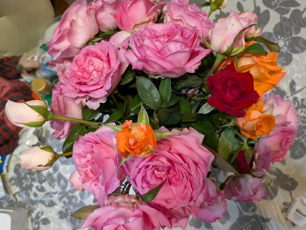 明日ゴミの日だしかなりくたびれてきたから終わりだな。まだ蕾のがあるからもう少し楽しめそうです。秋バラ色が濃いよねー✨香りも春より長持ちする気がする💕