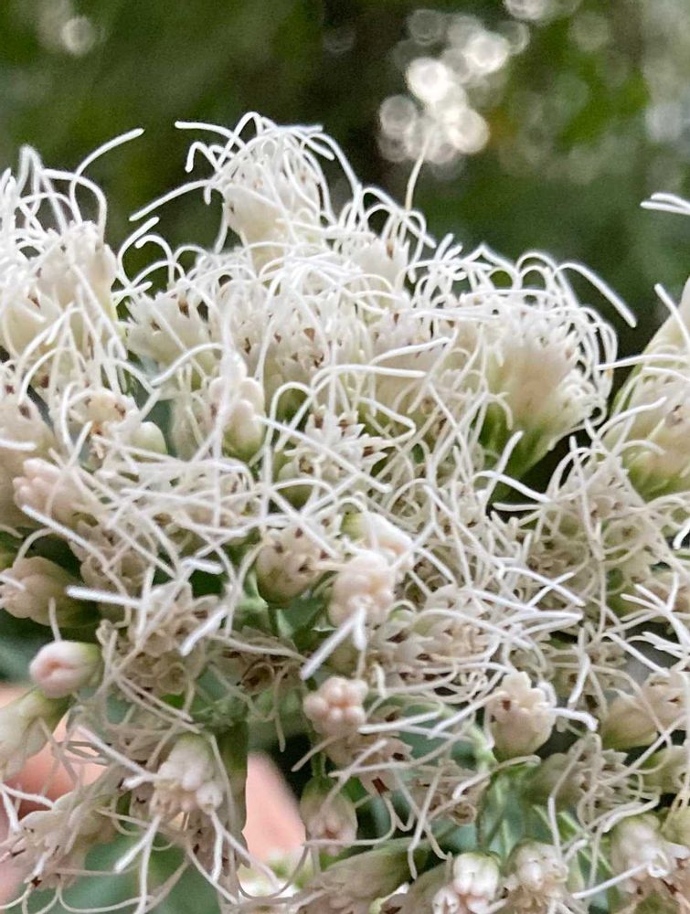 フジバカマは、小さな花が集まって1つの花のように咲いているのが特徴です。つぼみの時は、小さな丸い粒がぎゅっと詰まったように見えます。花が咲き始めると、糸のように細い花びらを広げ、ふわふわとした羽毛のような優しい花姿になります。