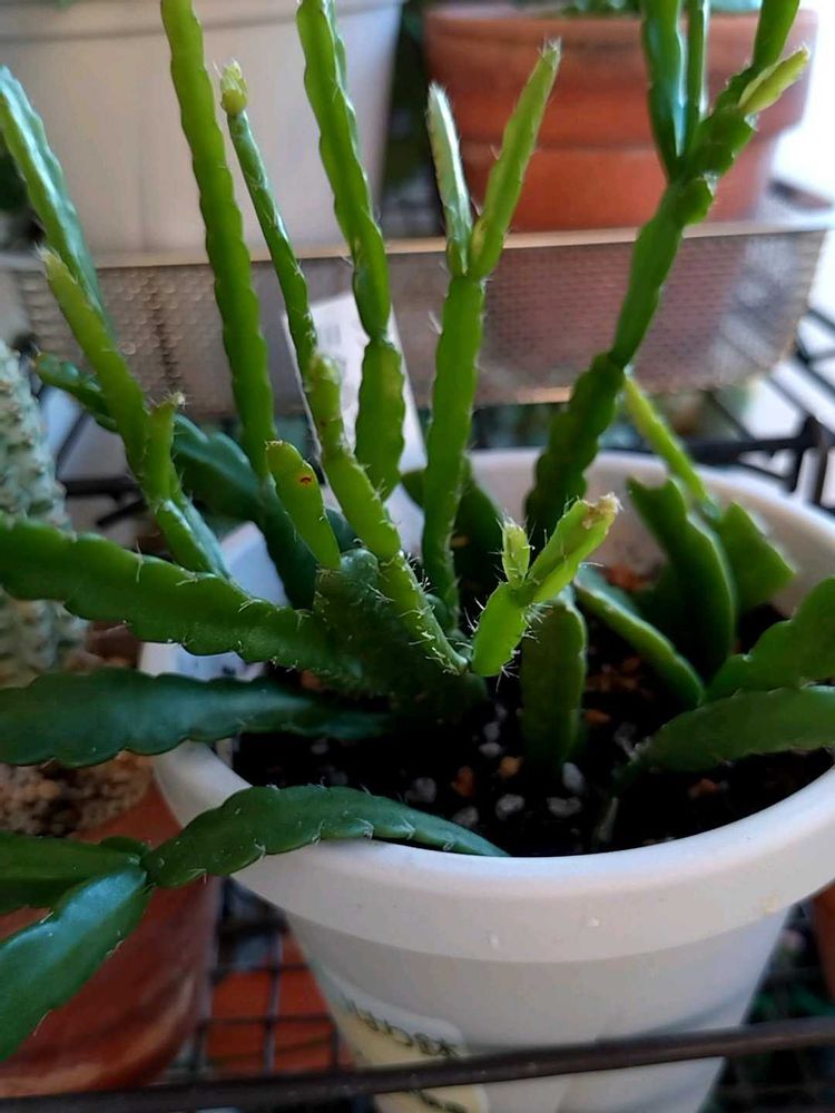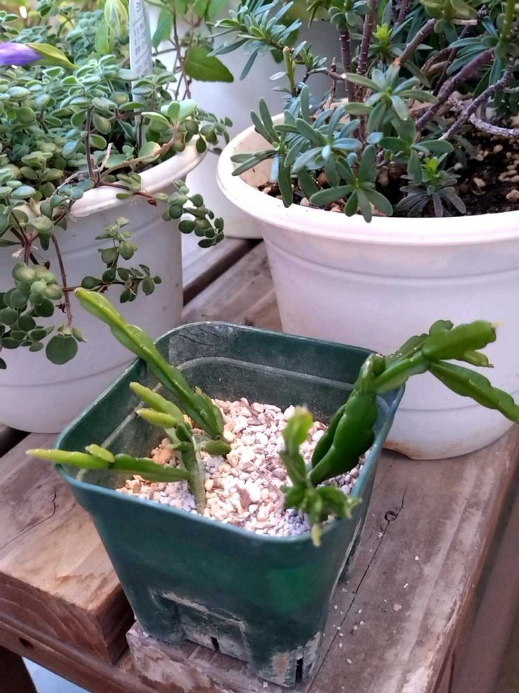 新入りのリプサリス💚鉢植えもう増やさないんじゃなかったっけ😅でも増えていきます🤣💦肉厚の葉っぱが見てて楽しい子🌱びろーんとしてた葉っぱをカットして挿し木にしました💚上手く根付くかなー😄🌱