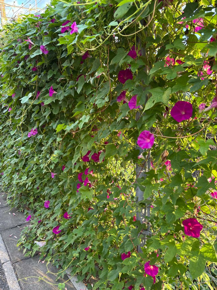 今朝、踏切が閉じて乗りたかった電車に乗れず、パワーアップしたフェンスのアサガオを撮影🚃
