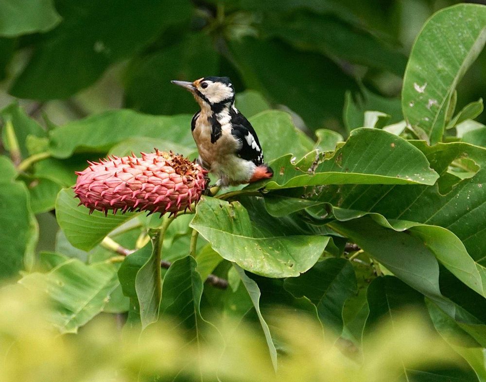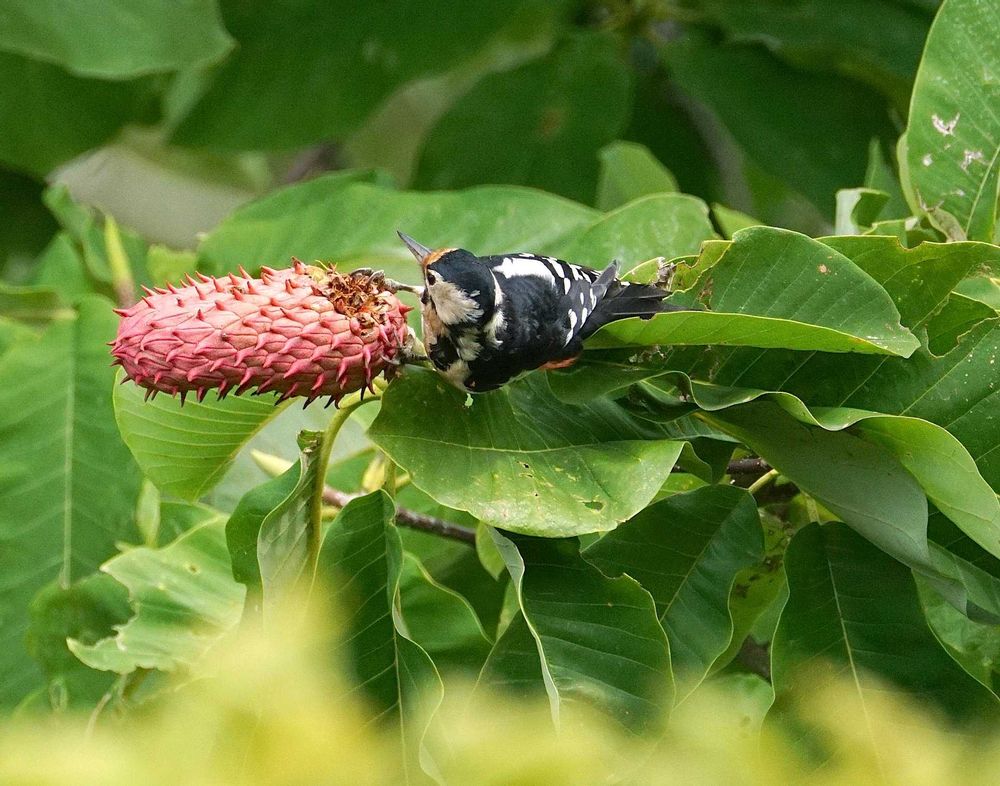 アカゲラ︎︎子さんがホオノキの実をつついてたよ〜😆