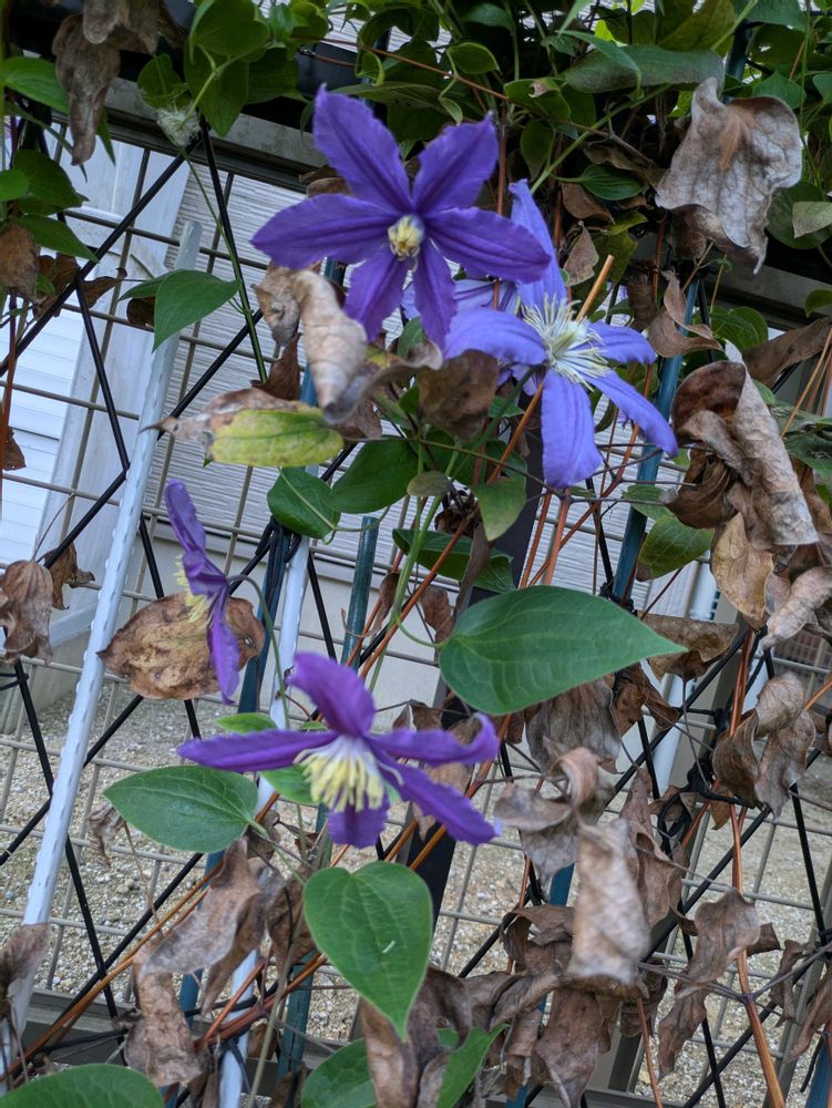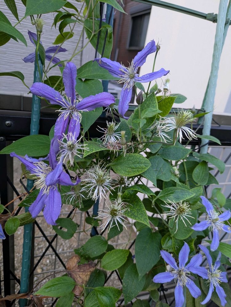 クレマチス サムシングブルー 3番花が終わりかけてシベだけになったものや、これから咲いてくるものや。