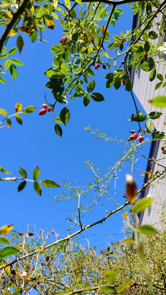 雲ひとつない真っ青な空に白い壁、緑の葉と赤い実気持ちのいい1枚👏👏👏