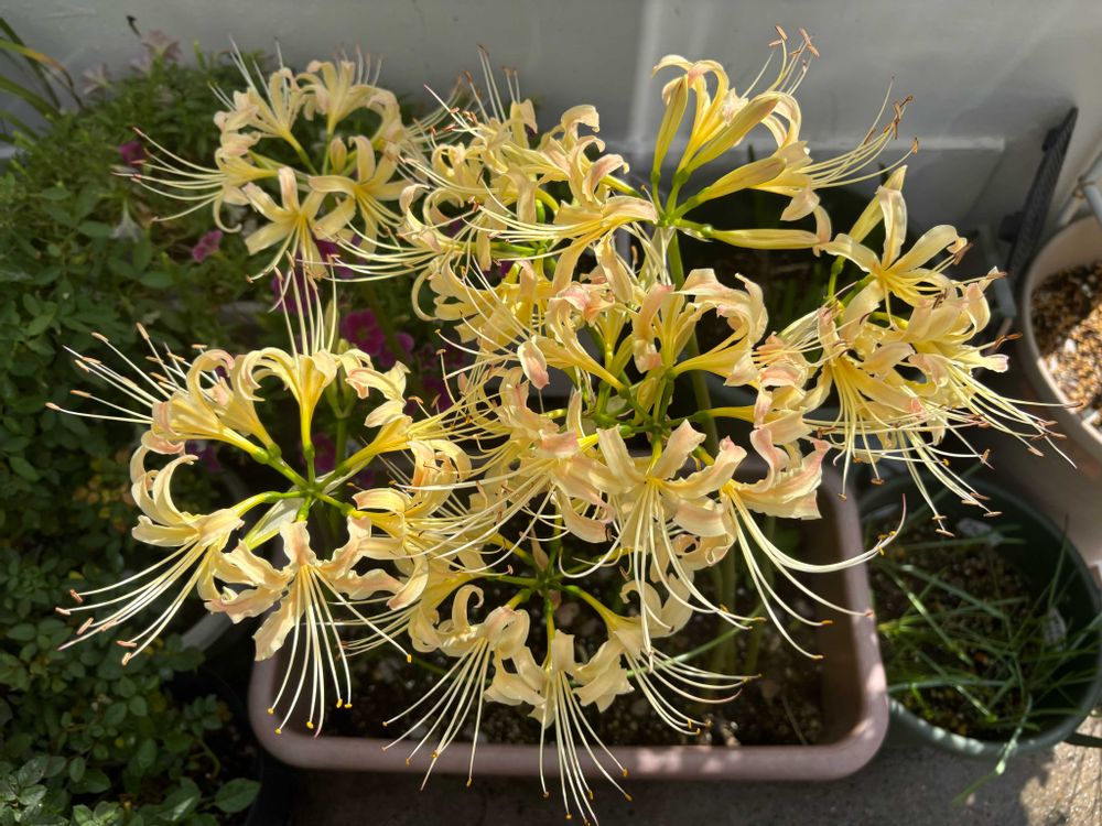 白いゼフィランサス、黄色いヒガンバナ、ダンギクが、いい感じです。🤍🤍🤍💛💛💛💜💜💜