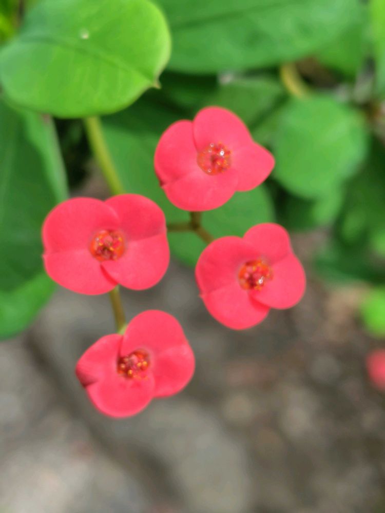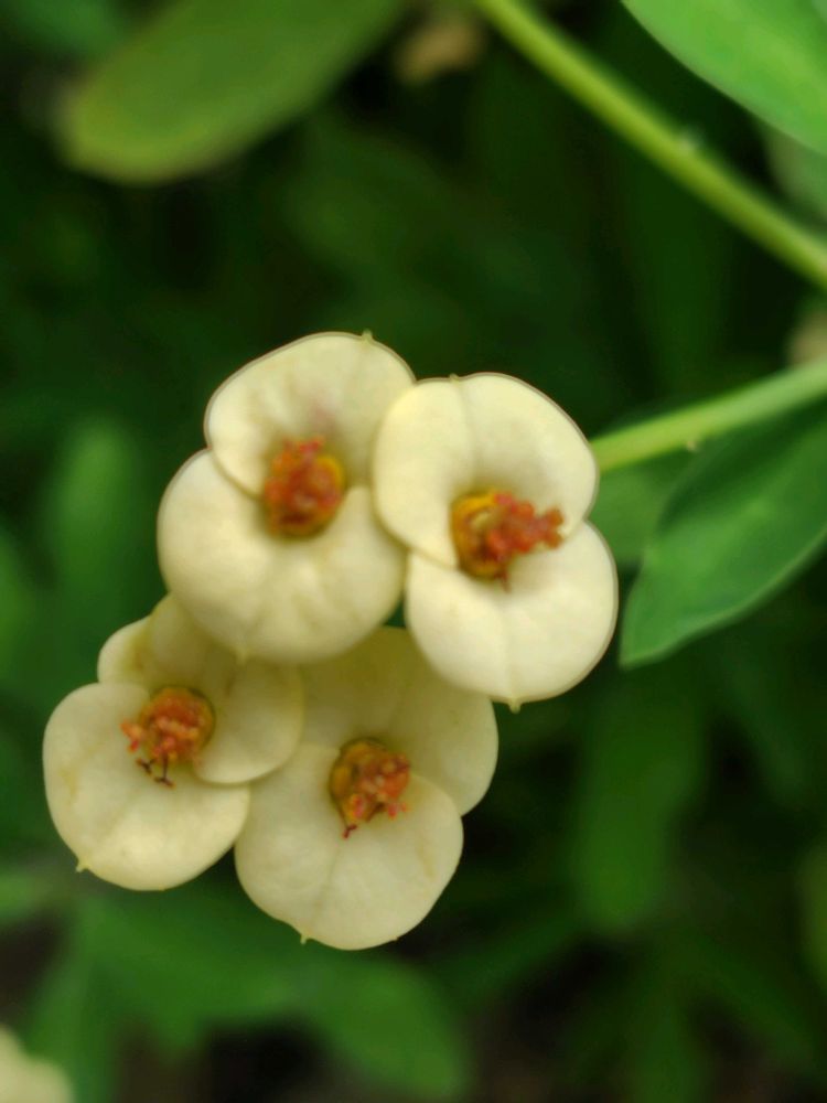 花は茎の先端に径1〜2cmの杯状花序(トウダイグサ科特有の形)となって、1対の花弁状の苞があって、これが赤、橙、黄、白に着色し目立つ。