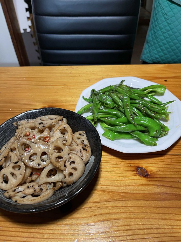 今日は午前中から台所でも遊んでおりました。シシトウの方はと言えば、同じアパートの先輩からのいただきものなんですが、近頃後半になればなるほど「辛い❗️」確率が高くなって来てまして、もう仕方がないので片っ端からふたつに割って種取ってから炒める事にしてます😋