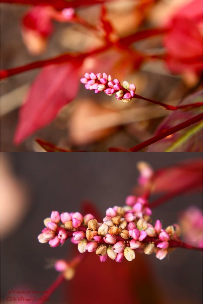 ・果実:痩果 長さ約2mmの3稜形、赤色の花被に包まれたまま、黒褐色に熟し、光沢がある