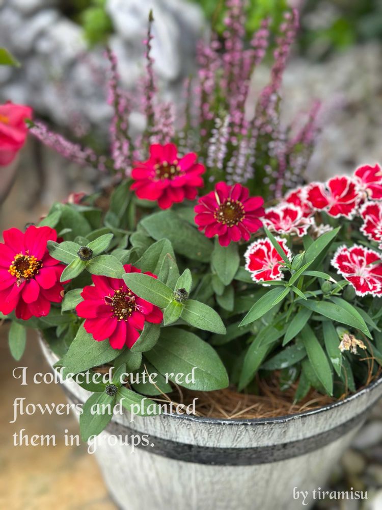 赤い花を集めて寄植えにして見ました🌺🌹🌷