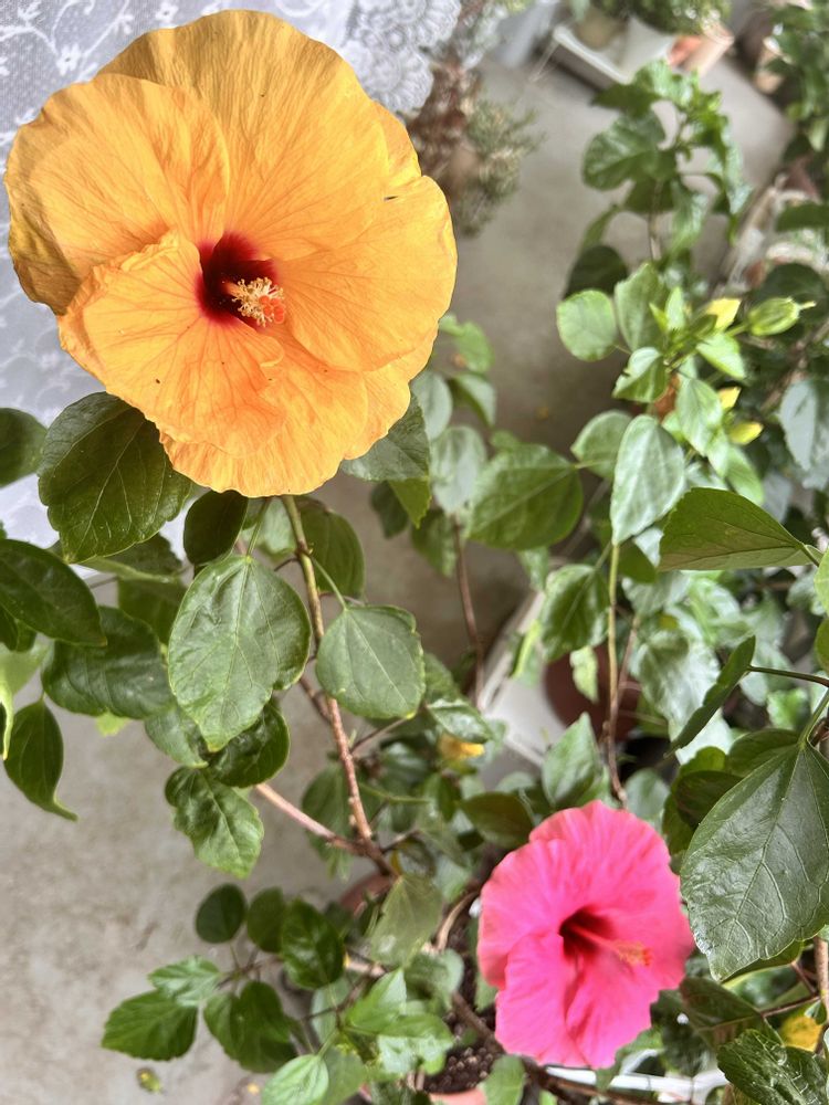 黄色ハイビスカスなのに突然ピンクの花が咲いてびっくりしてGoogleで調べてみたら🌳全体の先祖返りだそうです🤭