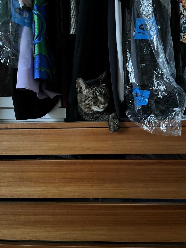 幼児では開けられない重いクロゼット扉をなぜか開けてしまうふくちゃん。頭だけ出して寛いでいます。私の服は猫の毛だらけでガムテープが欠かせません。