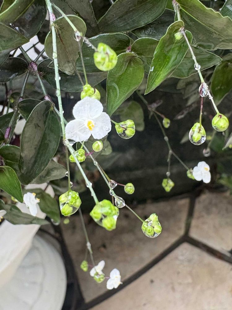 7月に切り戻してから今日初めてお花見つけたら、蕾が水滴💧に全て包まれてる💞💦✨✨✨ベールに包まれてる様で美しい💞