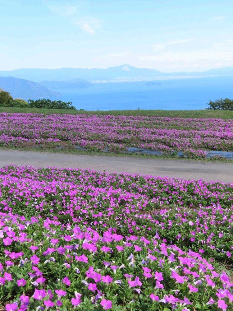琵琶湖と山々、一面ピンク色のお花が咲いて💓行ってみたくなりました😊💕