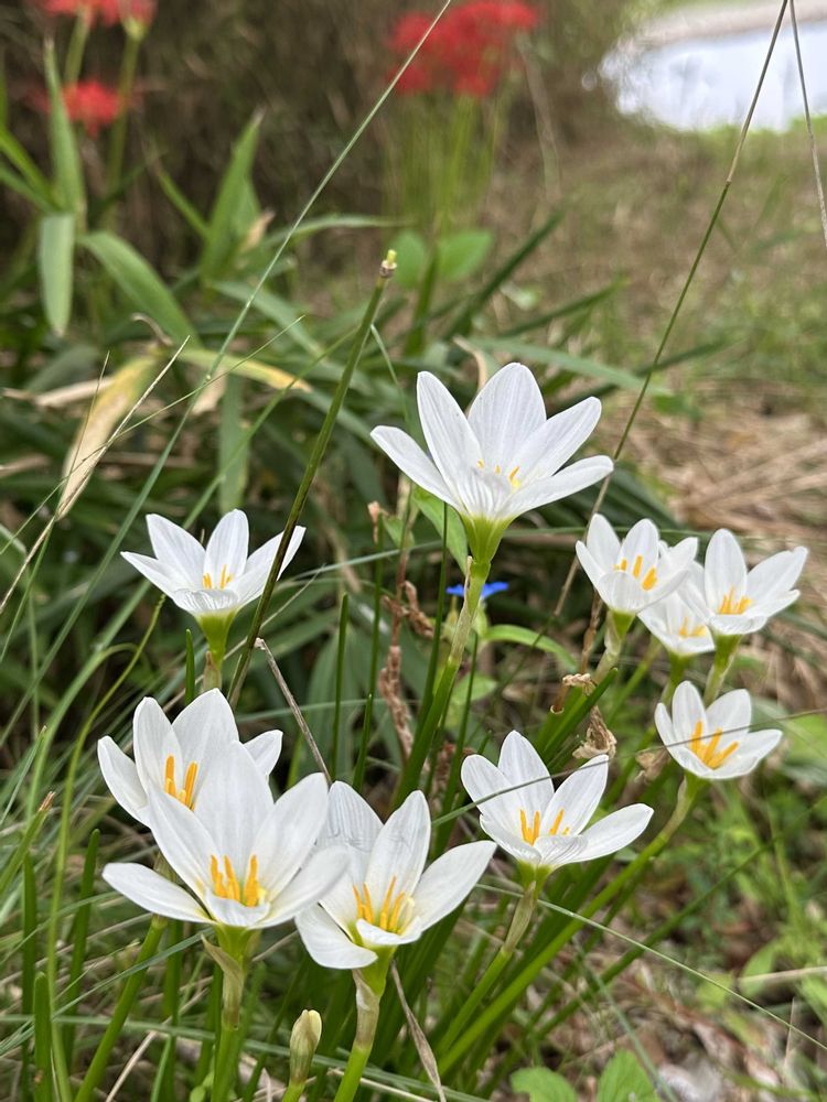 サイクリングロード沿い🚴白いゼフィランサスと後ろに彼岸花🌸